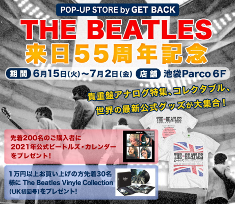 1982年12月8日高田馬場にオープンした世界最長の歴史を持つビートルズ専門店「GET BACK」を運営する株式会社JAMSHOPPING(本社:東京都渋谷区代表取締役:遠藤祐一)は、1966年6月30日(木)から7月2日(土)にかけて東京・日本武道館において行われたビートルズ来日公演の55周年を記念して、2021年6月15日(火)~7月2日(金)まで池袋パルコ本館6Fにてビートルズ専門店「GET BACK」を期間限定オープンいたします。