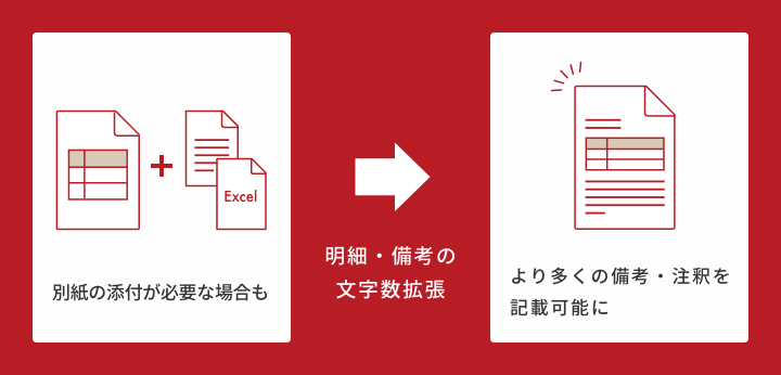 自由記述欄の文字数を拡張したことで、ユーザー各社様で業務上求められる要件に合った対外帳票を作成しやすくなります。また、Reformaで注記・備考をより柔軟に表記可能になることで、別紙の作成・添付などシステム外部での作業を減らし、業務負荷の軽減を実現します。