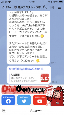 KDLでは少しずつではありますが、LINEでのお知らせにも力を入れていく予定です。ぜひお友達登録をお願いします。トーク画面のメニューからスタンプが購入できます。