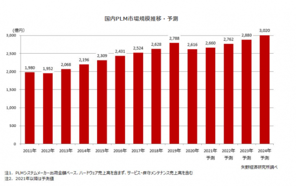 PLM市場はこれまでも経済動向、とくに製造業の設備投資に連動しており、海外では中国及び米国では既に成長に転じており、PLM世界市場はこれらの国々が牽引する見込みである。日本国内においては現在も緊急事態宣言が発出されるなど、非常に不透明な状況が続いているが、今後、大企業における設備投資が再び活性化すれば国内のPLM市場も本格的に回復すると見込まれ、2024年の同市場は3,020億円に達すると予測する。