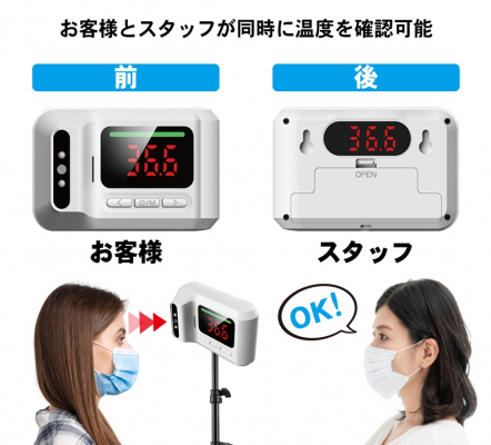 ・前後2画面にお客様とスタッフどちらも検温結果が確認できる