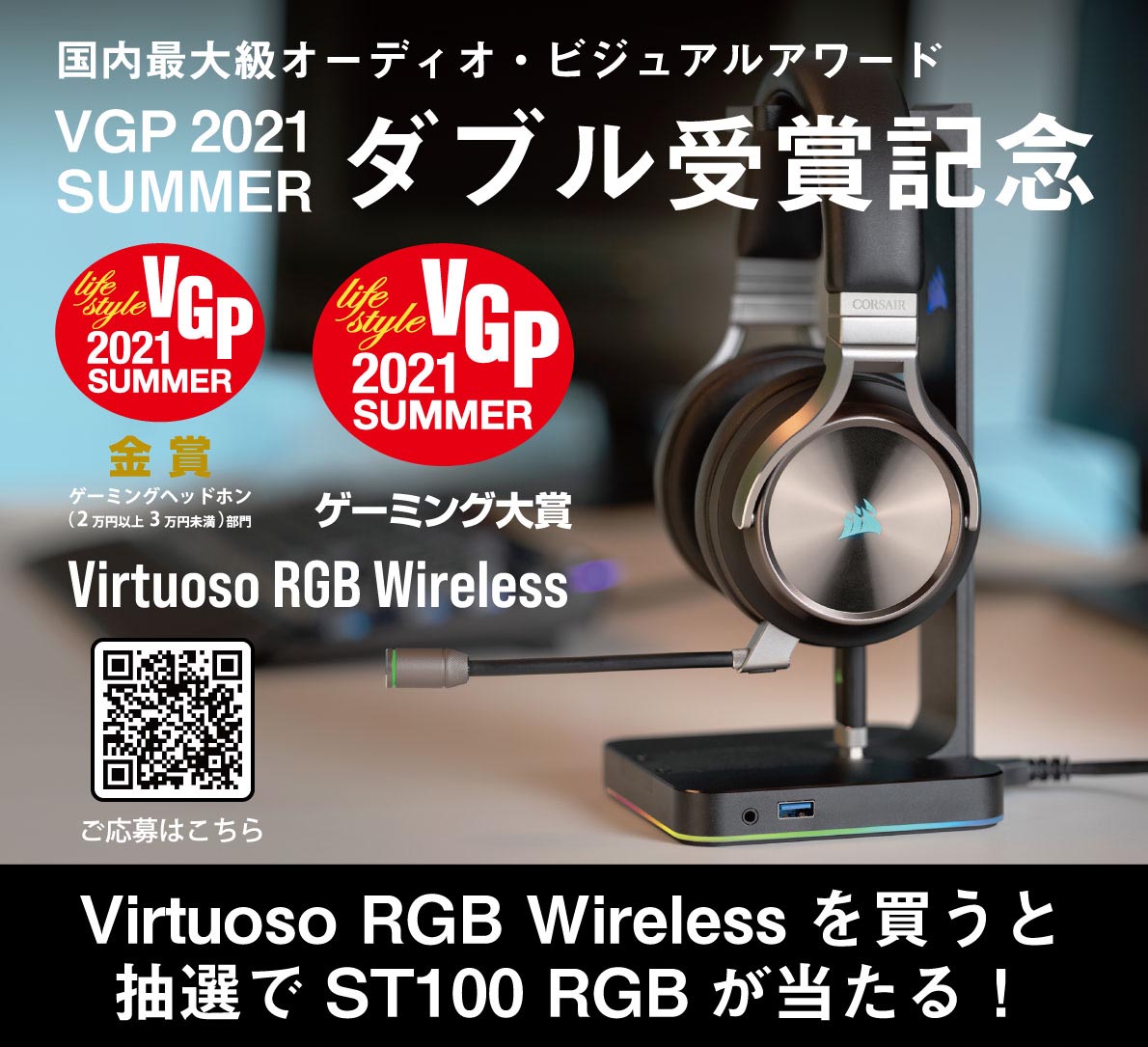 株式会社リンクスインターナショナル(本社:東京都千代田区、代表取締役:川島義之)は、CORSAIR製ゲーミングヘッドセット「Virtuoso RGB Wireless」が国内最大級のオーディオ・ビジュアルアワード「VGPゲーミング大賞」「ゲーミングヘッドホン(2万円以上3万円未満)部門 金賞」においてダブル受賞したことを記念し、受賞製品を対象に多機能RGBヘッドセットスタンド「ST100 RGB」が抽選10名様に当たるプレゼントキャンペーンを2021年6月10日から2021年7月31日まで実施します。
