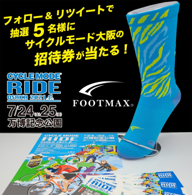 コーマ株式会社(所在地:大阪府松原市 代表:吉村盛善)が展開するソックスブランド「FOOTMAX」は、2021年7月24日(土)、25日(日)に行われる、サイクルモード実行委員会主催の西日本最大のスポーツ自転車フェスティバル「CYCLE MODE RIDE OSAKA 2021」に出店いたします。