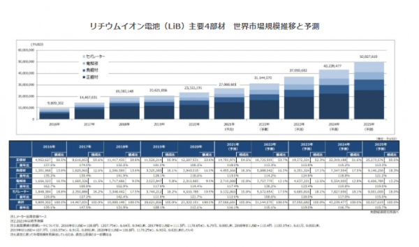 コロナ禍でもLiB(セル)は引き続き成長基調にあり、車載用セル向けに成長が加速しているLiB主要4部材世界市場は2021年以降も成長が続く見通しであるが、材料トレンドにはいくつかの変化が見られる。
