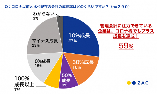 管理会計の分析に注力できている企業( 「注力している」122社、「やや注力している」168社)では、コロナ禍でも59%がプラス成長を達成していることがわかりました。