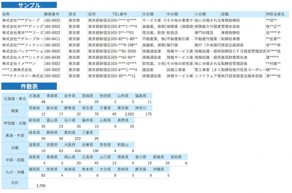 ▽サンプル&件数表(上場企業のIR担当者リスト)