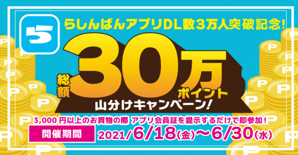 感謝の気持ちを込めて、「らしんばんアプリダウンロード数3万人突破記念! アプリ登録者限定 総額30万円分のポイント山分けキャンペーン」を実施いたします。