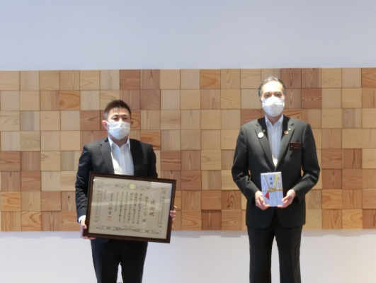 神奈川県贈呈式(左:ノジマ野島廣司、右:黒岩祐治神奈川県知事)