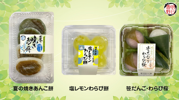 2回目となる今回は、塩分が不足しがちな夏場にぴったりの「夏の焼きあんこ餅」ほか、「塩レモンわらび餅」、「笹だんご・わらび桜」を抽選で5名様にプレゼントいたします。