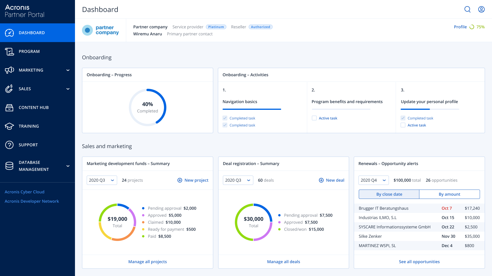 ● 簡単なナビゲーション。集中ダッシュボードでアカウントの概要をひと目で確認できます。サポートケースやMDF、案件登録、契約更新案件などを表示するウィジェットはカスタマイズも可能です。パートナープログラムのメリットや要件、特別なキャンペーンへ迅速にアクセスすることができます。既存のアクロニス管理コンソールの設計を反映したインターフェイスで、役割や責務に基づいたアクセスの設定が可能です。