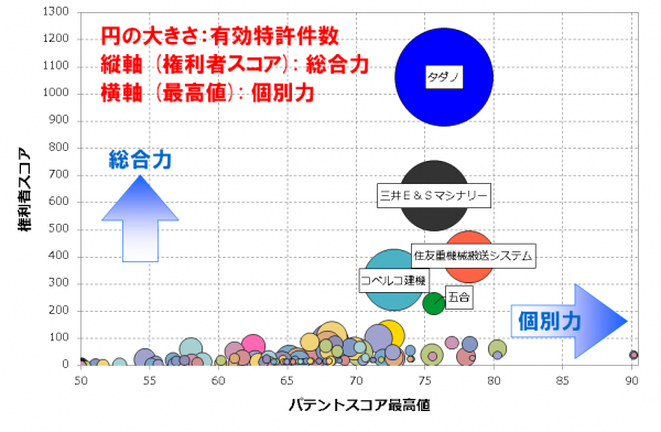 クレーンは、巨大な荷物や重量物を吊り上げた状態で効率よく移動できるため、運輸・製造・建設等の現場において欠かすことのできない機械として利用されています。本調査では、日本の特許庁で公開されているクレーン全般における「制御技術」に着目し、個別特許の注目度を得点化する「パテントスコア」をベースに、特許の質と量から総合的に見た評価を行いました。