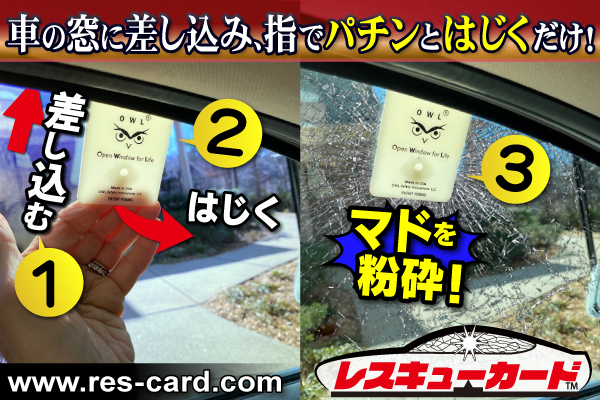【レスキューカード】は物理的な力ではなく、窓ガラスの「エネルギー」を使い、カード自体が大きな「バネ」として働くことで、車の強化ガラスを粉砕します。