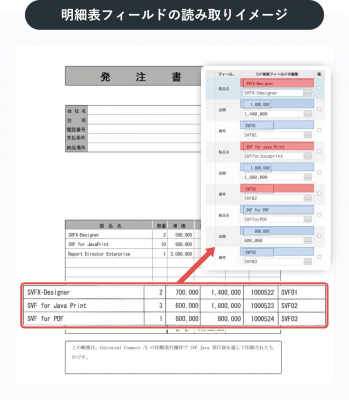 明細表の読み取り対象の見出し項目を指定することで、位置を指定することなく明細をデータ化することが可能になります。具体的には、指定した見出し項目を含む表の明細行または明細列のテキストを繰り返し読み取る設定を行います。