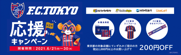 トレジャー・ファクトリーでは、東京都の一部店舗にて、FC東京のファン・サポーターの皆様、FC東京を応援する地域の皆様向けに「FC東京応援キャンペーン」を開催いたします。2021年4月に実施したキャンペーン第1弾では、買取金額を20%アップ特典を提供いたしました。今回のキャンペーン第2弾では、東京都の一部対象店舗でお買い物の際に、税込1,000円以上のお買い上げで会計から200円を割引させていただく特典を提供いたします(利用条件やキャンペーン詳細は次項を参照)。この機会にぜひトレファクでのお買い物をご利用ください。