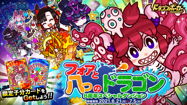 株式会社アソビズム(本社:東京都千代田区、代表取締役:大手智之)は、App Store・Google Playにて好評配信中のリアルタイム合体カードバトル『ドラゴンポーカー』で、2021年6月21日(月)より8周年スペシャルダンジョン「フォアと八つのドラゴン」を開催いたします。