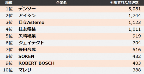 集計の結果、2020年に最も引用された企業は、1位 デンソー、2位 アイシン、3位 日立Astemoとなりました。