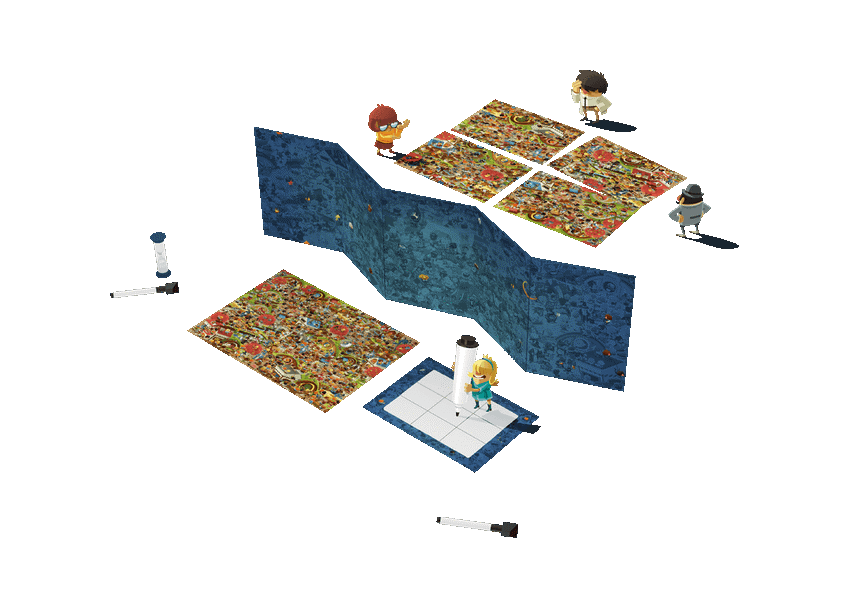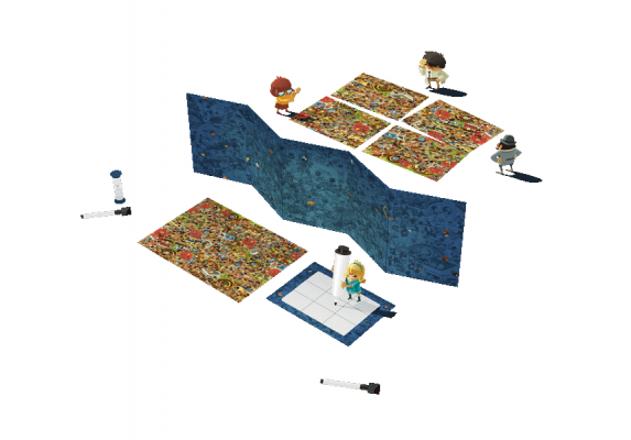 ●内容物/容疑者約300人が描かれた犯行現場 6種、ついたて 1枚、描き消しできるボード 4枚、砂時計 1個、ホワイトボードマーカー 2本、透明のトークン 1個 他