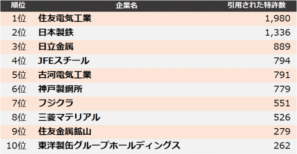 集計の結果、2020年に最も引用された企業は、1位 住友電気工業、2位 日本製鉄、3位 日立金属となりました。