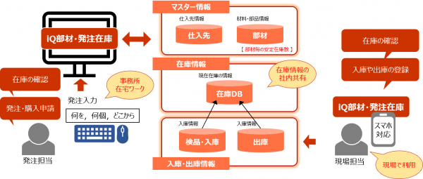 今回発売開始をする「iQ部材・発注在庫ソフト」は製造に必要な「原材料」、「使用部品」等を購入申請から、仕入れ・在庫登録・在庫引き当てなどの在庫管理を一元管理できるソフトになります。