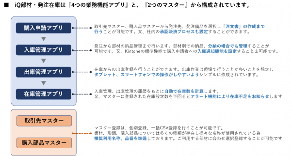 [iQ部材・発注在庫ソフト]は「2つのマスター」と「4つの業務機能アプリ」から構成されております。