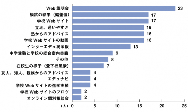 1位…「Web説明会」(23票)、2位…「模試の結果(偏差値)」(17票)、3位…「学校Webサイト」(17票)という結果でした。