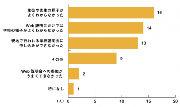 1位…「生徒や先生の様子がよくわからなかった」(16票)、2位…「Web説明会だけでは学校の様子がよくわからなかった」(14票)、3位…「現地で行われる学校説明会に申し込みができなかった」(13票)という結果でした。