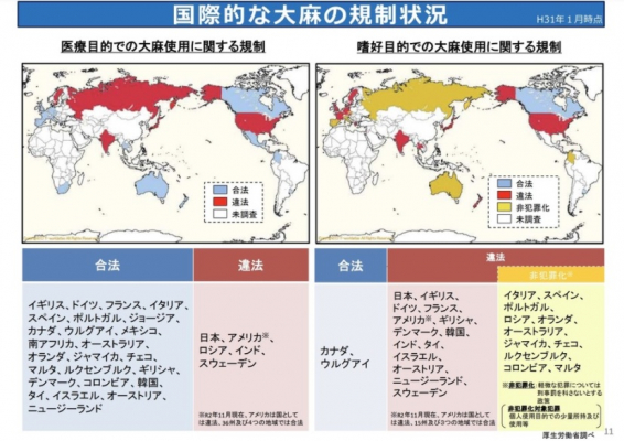 大麻において国家レベルで全面合法化したのは、カナダ、ウルグアイ、アメリカ(15州)。EUでは、販売や使用にライセンスが必要な医療目的での合法化がなされている場合がある。