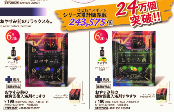 ラベンダーブレンドの香りの「おやすみ前の疲労回復入浴剤ぐっすり」とシトラスブレンドの香りの「おやすみ前の疲労回復入浴剤すやすや」の2種類があります。