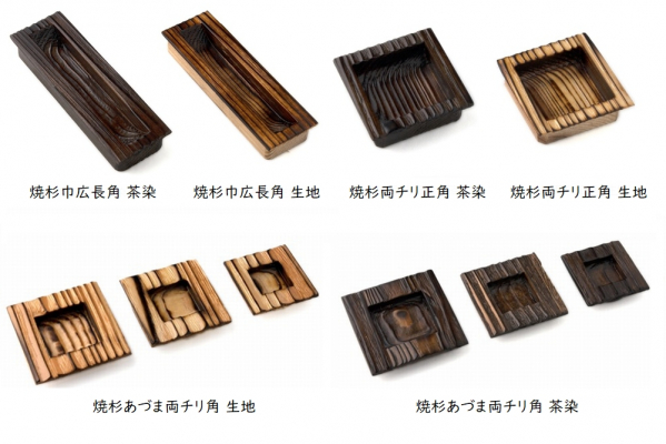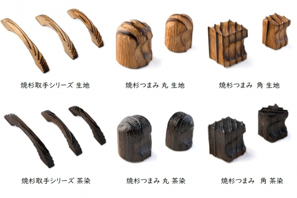 杉材は特に柔らかい素材で室内部品の「取手」や「引手」、「つまみ」などにはあまり使われません。また、「焼杉」の独自性は、茶色に焼け焦げた色にあります。木材を焼く工法である為、「炭」の付着によって調色するのですが、手に触れる室内部品では「炭」の付着を解決しなければなりません。「焦げた色」はそのまま活かし「炭」が手などに付着しない方法…。一般的考えると解決策はありません。