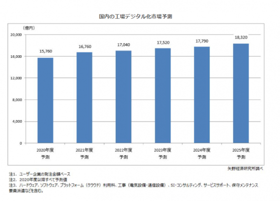 これらにより、製造現場では多様なデジタル活用が起こっており、2020年度の国内の工場デジタル化市場規模を、ユーザー企業の発注金額ベースで1兆5,760億円と予測する。