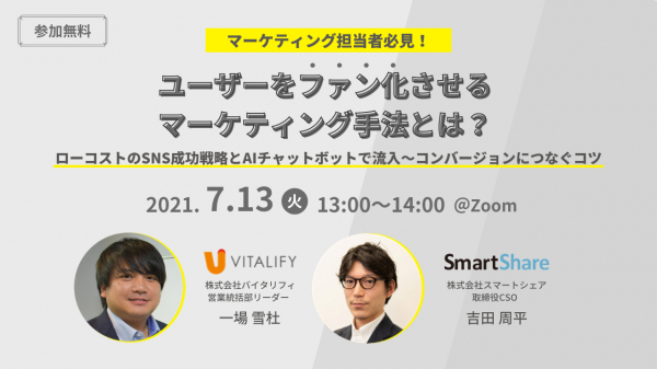 ベトナムオフショア開発やAI(人工知能)事業を行う株式会社バイタリフィ(所在地:東京都渋谷区、代表取締役:川勝 潤治)は、SNSマーケティングプラットフォームOWNLY(オウンリー)を提供するスマートシェア株式会社(東京都港区海岸、代表取締役 西山 統)と共催で無料ウェビナー『ユーザーをファン化させるマーケティング手法とは?ローコストのSNS成功戦略とAIチャットボットで流入~コンバージョンにつなぐコツ』を2021年7月13日(火)に開催します。