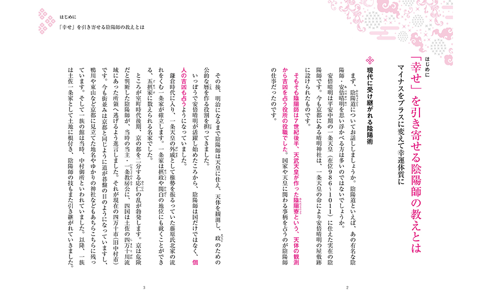 この本の中では、陰陽術を使って「恋愛運」「人間関係の円滑化」「健康」「金運」などをメインに、運を上昇させる方法を紹介しています。