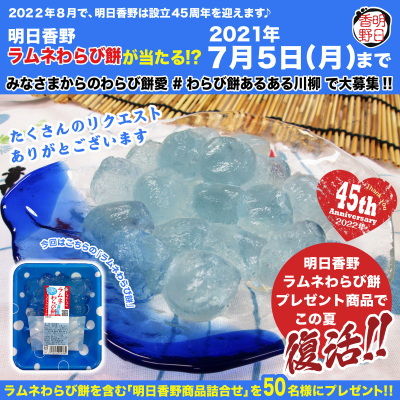 この度、以前販売していた「ラムネわらび餅」についてインターネットでアンケートを行いましたところ、多数の「食べたい」とのご要望をいただきました。