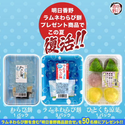 投稿していただいた方の中から抽選で50名様に、SNSでも話題となった「ラムネわらび餅」ほか、看板商品の「わらび餅」、見た目も涼しげな「ひとくち涼菓」をプレゼントいたします。