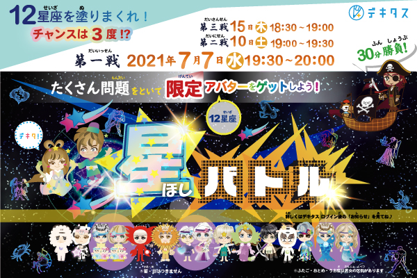 株式会社城南進学研究社(本社:神奈川県川崎市、代表取締役社長CEO:下村勝己)が運営する小中学生対象のオンライン学習教材「デキタス」は、2021年7月7日(水)から全3回、デキタス会員向けイベント『星バトル』を開催いたします。
