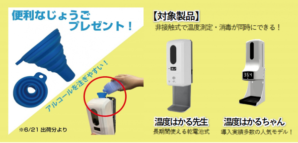 ミスターカード株式会社(本社所在地:埼玉県川口市)は、非接触式温度測定&アルコール消毒ディスペンサー「温度はかる先生」&「温度はかるちゃん」シリーズを購入されたお客様にアルコール消毒液の補充時にとっても便利なじょうごをプレゼント!2021年6月21日からの出荷分に同梱いたします。