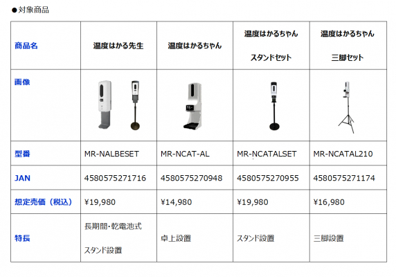 ・商品名:温度はかるちゃんスタンドセット(型番:MR-NCATALSET)想定売価¥19,980