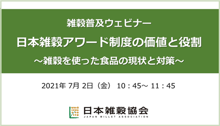 健全な雑穀の普及に取り組む、一般社団法人日本雑穀協会(会長 倉内伸幸 日本大学生物資源科学部教授)は、オンラインセミナーとして『日本雑穀アワード制度の価値と役割 ~雑穀を使った食品の現状と対策~』を2021年7月2日(金)にウェビナー形式で実施いたします。