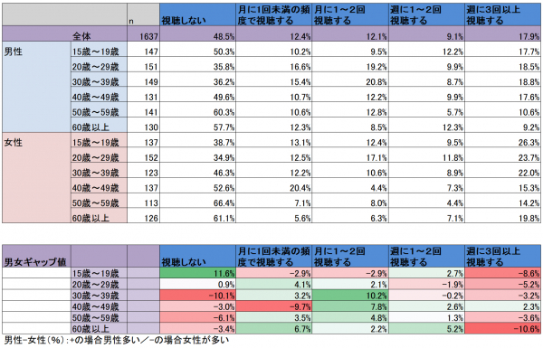 女性のほうがより頻繁にテレビを利用してインターネット動画を視聴することがわかった一方、テレビを利用しないのも女性の割合が高くなっています。