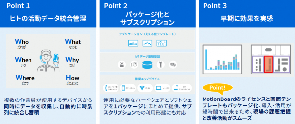 〈「Meister Apps 現場作業見える化パッケージ」と「MotionBoard」連携の特長〉
