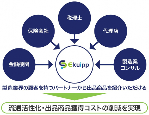 Ekuippの強みは、中古機器の売買マッチング機能だけに留まらず、家電等の中古品売買で年商100億円を誇る株式会社浜屋と資本提携を締結しており、同社による買取・リサイクル・リユース機能も備えていることです。また、税理士や保険会社、金融機関や製造業のコンサル会社など法人紹介ルートの増加により、仕入れ商品発掘コストを削減できています。