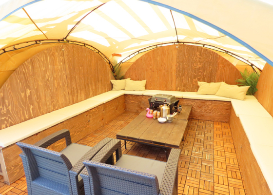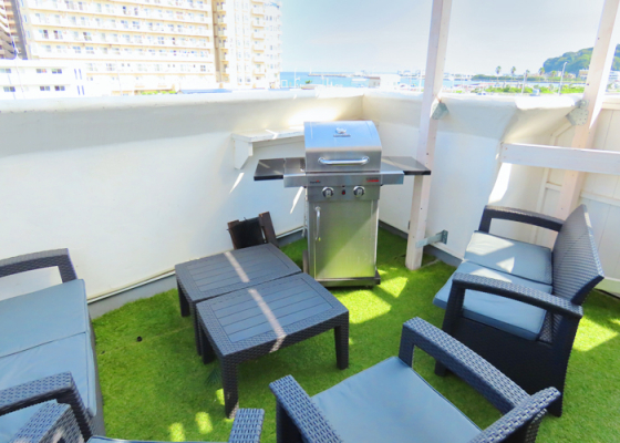 リバーサイド(Web: https://www.hemingway.cafe/bbq/riverside/ )はヘミングウェイ(Web: https://www.hemingway.cafe )が運営する湘南・江ノ島の海が一望できる屋上のグランピングBBQ会場です。小田急片瀬江ノ島駅前のロータリーを横切り、川沿いを進んだ所に好アクセスに位置します。リニューアルオープンに伴い、屋上で大人数でのグランピングBBQができる大型テントだけでなく、横には屋根付きのソファー席も設備し、以前よりもくつろぎながらBBQができる充実した空間となっております。屋上の開放的な空間で、江の島や湘南の海の景色を眺めながら、美味しいBBQを堪能できる最高のひと時を提供します。