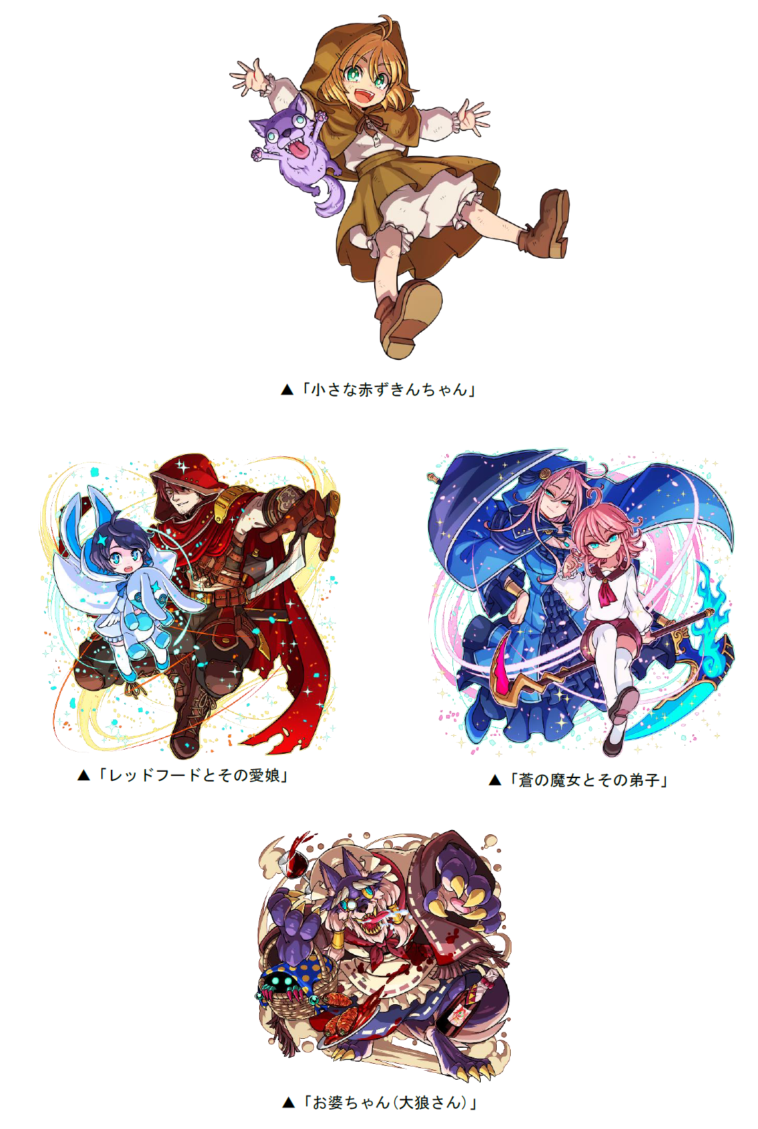 また、道中には「小さな赤ずきんちゃん」「レッドフードとその愛娘」「蒼の魔女とその弟子」などが出現し、クリアした際に手に入る「おつかいP」を貯めると、DRAレア「お婆ちゃん(大狼さん)」などと交換できます。