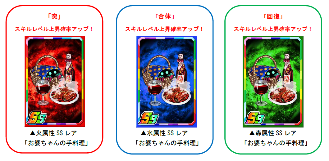 限定強化素材「お婆ちゃんの手料理」は一部のモンスターに使うと強化値2倍の効果があるほか、突・合体・回復のスキルレベル上昇確率もアップします。
