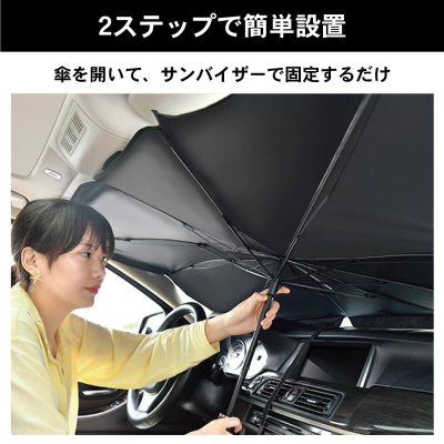 【2ステップで簡単設置】 傘を開いて、サンバイザーで固定すれば取り付け完了。