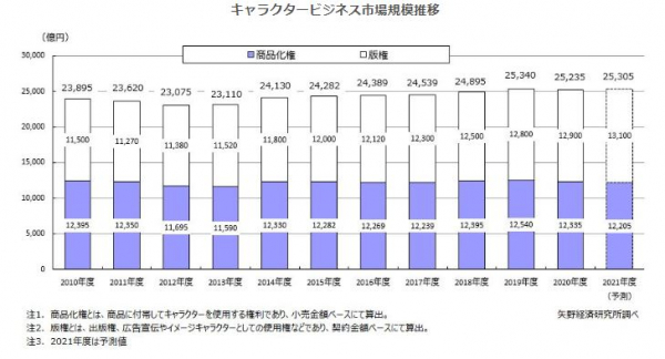 キャラクタービジネス市場は商品化権と版権とで構成され、2020年度の商品化権市場(小売金額ベース)は前年度比98.4%の1兆2,335億円、版権市場(契約金額ベース)は同100.8%の1兆2,900億円となり、商品化権市場がマイナスとなった一方で、版権市場はプラス成長となった。商品化権はヒット作の影響による波があり、また少子化による市場のパイの縮小で売れ難くなっている一方で、版権はSNSや動画配信サービスの浸透などの影響により広告宣伝やイメージキャラクター起用が積極的に行われており、増加傾向にある。