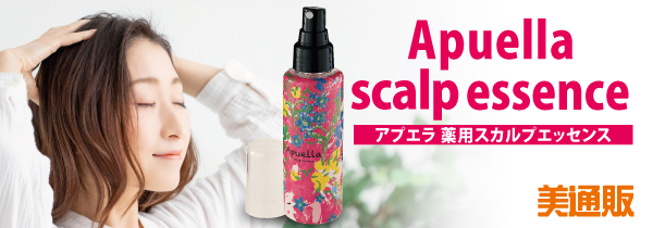 今回ピックアップした「アプエラ 薬用スカルプエッセンス」は、頭皮・髪の悩みを解消するためにつくられた酵素入スカルプエッセンスです。3種類の有効成分、塩化リゾチーム(消炎酵素)とヒノキチオール、酢酸トコフェロール(ビタミンE誘導体)と9つの植物成分を配合。ノンアルコール、無着色、無香料、無鉱物油、石油系界面活性剤不使用なので、敏感肌にもやさしく、育毛、養毛、発毛促進、毛生促進、薄毛、脱毛の予防、ふけ、かゆみ、病後・産後の脱毛などさまざまな悩みに効果が期待できるヘアケアです。地肌にやさしい低刺激なので、髪のボリュームにお悩みの方から、ハリコシが欲しいエイジング世代まで幅広いお客様層にオススメしやすく、店販アイテムとしてもデイリーユースのヘアケアとして最適です。「美通販」では、低コスト・高品質の「アプエラ 薬用スカルプエッセンス」(株式会社レイナカンパニー)を、業界最安値を目指した美通販会員特別価格でご提供いたします。この機会にぜひお試しいただければと考えおります。