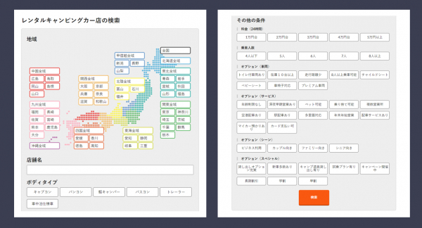 こちらを利用する事により、キャンピングカーレンタル利用希望者は様々なレンタル店舗を調べる事なく、希望に沿った条件のレンタルキャンピングカーを見つけていただく事が可能です。