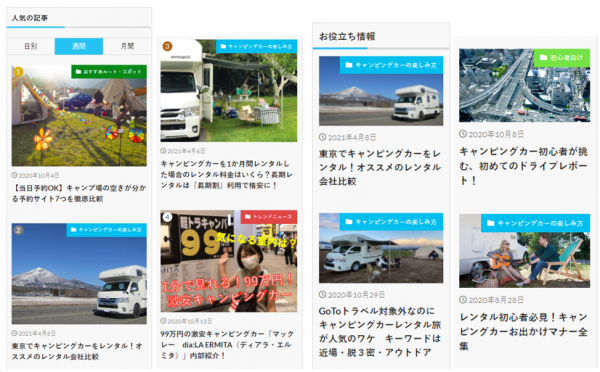 キャンピングカー株式会社では、日本で最大級のキャンピングカーレンタルサービス「ジャパンキャンピングカーレンタルセンター」を運営しています。そのノウハウを活かし、キャンピングカーをはじめてレンタルする利用者向けのお役立ちコンテンツ集など、実際にキャンピングカーレンタルを行ってきた事業者だからこそ発信できるコンテンツを拡充しています。