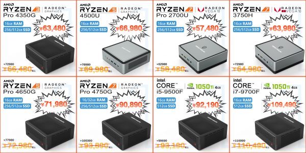 セール対象はAMD RyzenとIntelのプロセッサ搭載、OFFICE用、家庭用、ゲームまで幅広く活躍できるミニPCを8つのモデル用意いたしました。